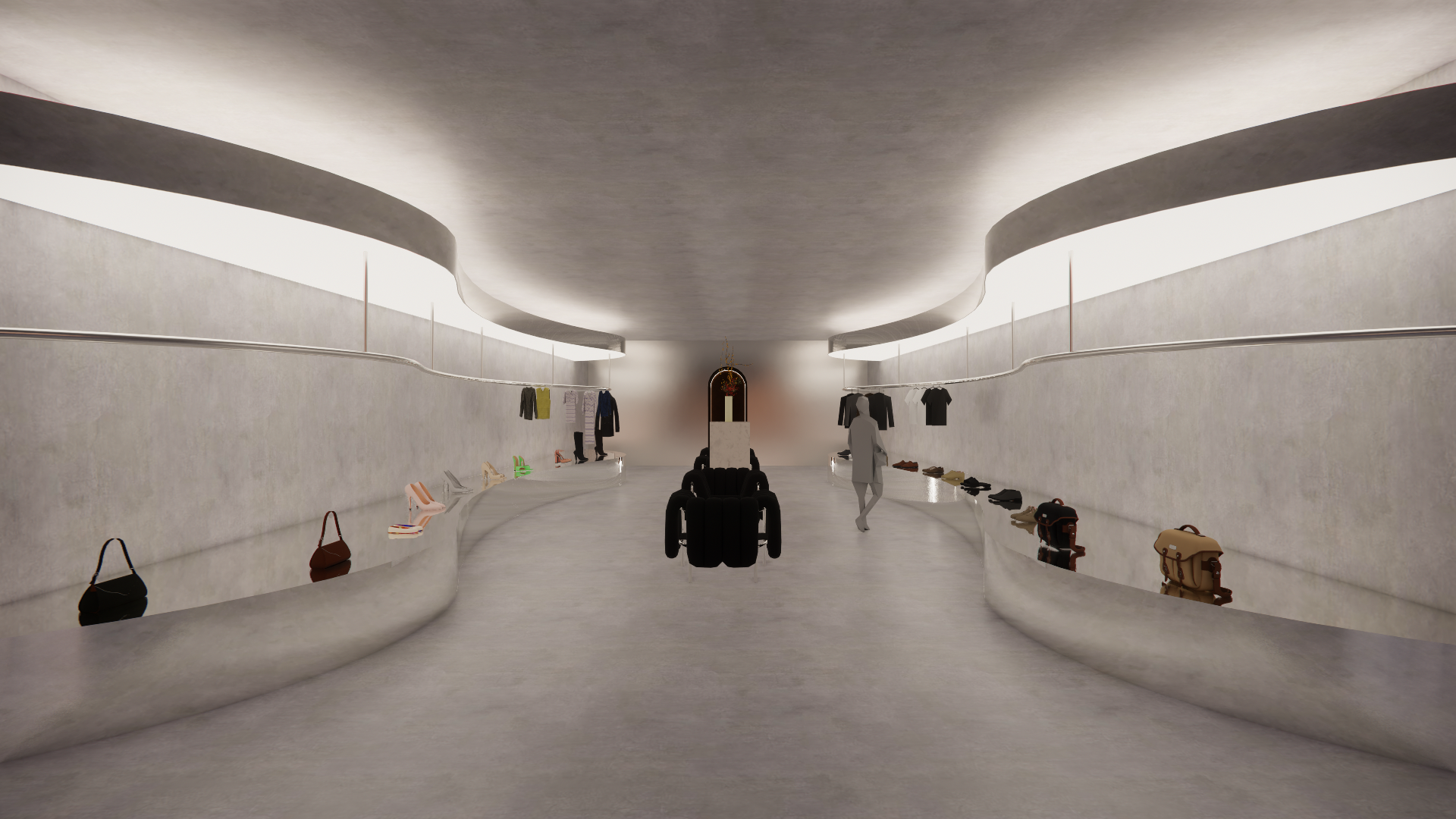 Developed for a private client with ventures in high-end boutiques, this concept explores retail as an immersive and sensorial experience. The design transforms a linear shell into a sculptural environment where light, reflection, and material define the atmosphere.